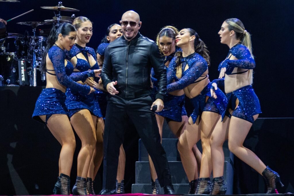Desde el inicio, Pitbull cautivó al público con su presencia arrolladora. El escenario se iluminó con luces brillantes y pantallas gigantes que mostraban imágenes vibrantes, creando una atmósfera electrizante. Con su característico traje oscuro y gafas oscuras, Pitbull se adueñó del escenario, saludando al público con su famoso “¡Dale!” y agradeciendo a sus fans por el apoyo. La interacción con el público fue constante, animando a la multitud a cantar, bailar y disfrutar del momento.